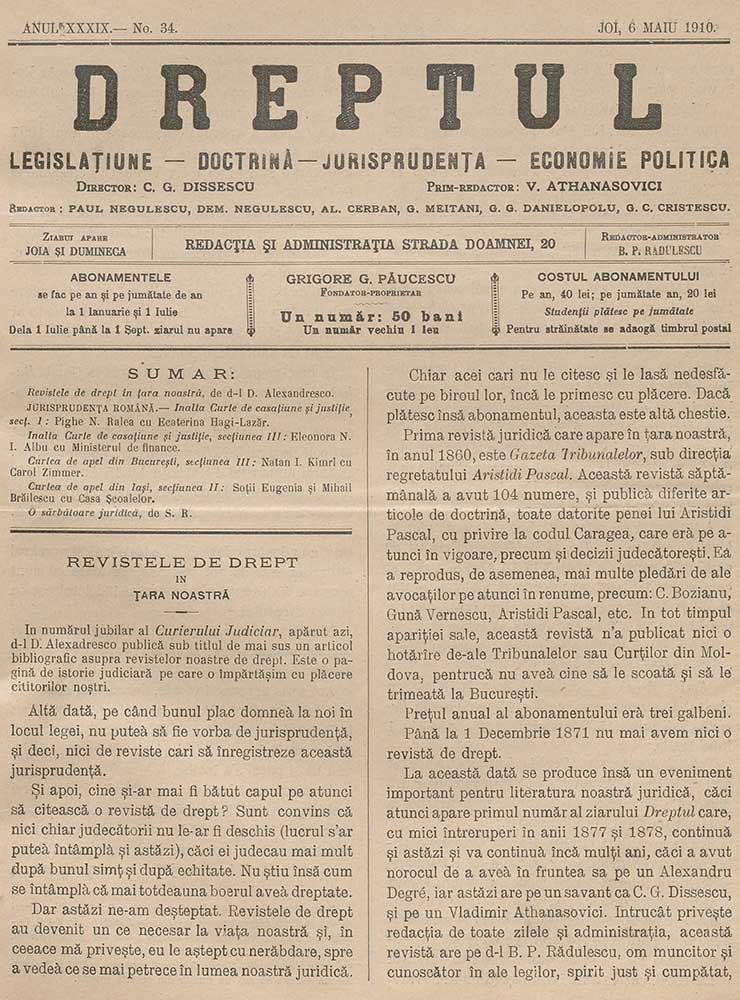 Dreptul, XXXIX, nr. în TOM: 34, 6 mai, 1910 Descarcă Citește × --> Anul publicației: 1910 Publicată de: Institutul de Istorie „Nicolae Iorga” București Contributori: Institutul de Istorie „Nicolae Iorga” București Tipul publicației: periodic Vezi publicația: Dreptul Domenii asociate: Drept, Științe juridice
