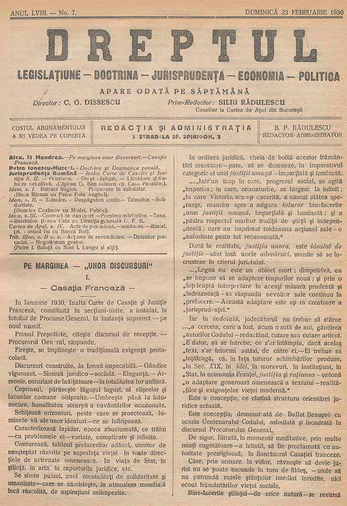 Dreptul, LVIII, nr. în TOM: 7, 23 februarie, 1930 Descarcă Citește × --> Anul publicației: 1930 Publicată de: Institutul de Istorie „Nicolae Iorga” București Contributori: Institutul de Istorie „Nicolae Iorga” București Tipul publicației: periodic Vezi publicația: Dreptul Domenii asociate: Drept, Științe juridice