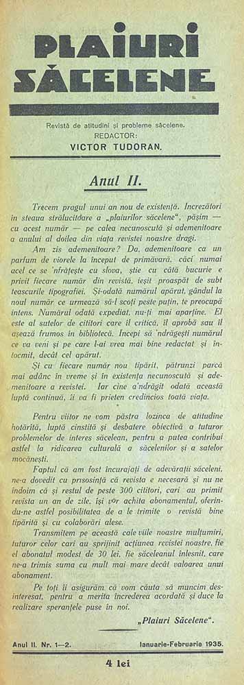 Plaiuri Săcelene, II, nr. în TOM: 1-2, ianuarie-februarie, 1935, Revistă de atitudini și probleme săcelene
