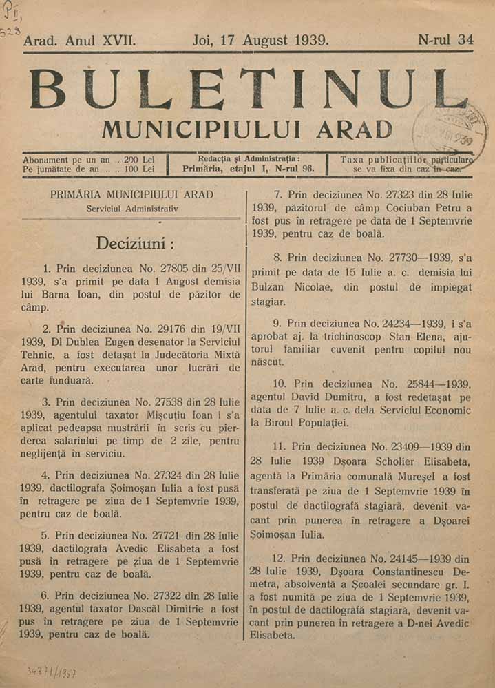 Buletinul Municipiului Arad, XVII, nr. în TOM: 34, 17 august, 1939