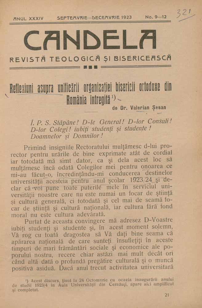 Candela, XXXIV, nr. în TOM: 9-12, septembrie-decembrie, 1923, Revistă teologică și bisericească