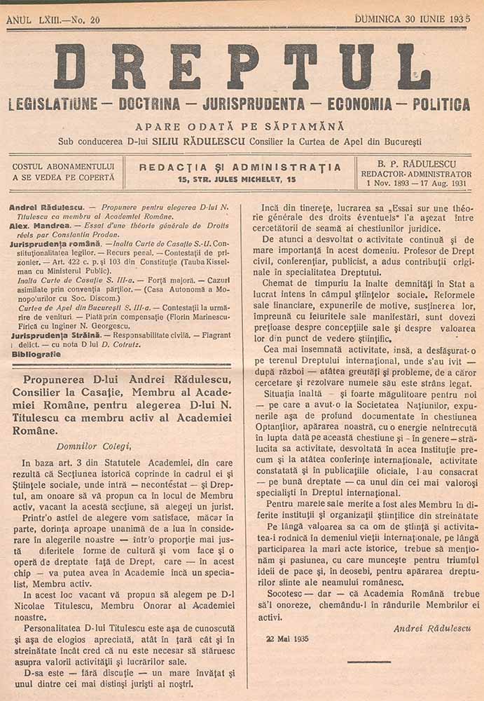 Dreptul, LXIII, nr. în TOM: 20, 30 iunie, 1935 Descarcă Citește × --> Anul publicației: 1935 Publicată de: Institutul de Istorie „Nicolae Iorga” București Contributori: Institutul de Istorie „Nicolae Iorga” București Tipul publicației: periodic Vezi publicația: Dreptul Domenii asociate: Drept, Științe juridice