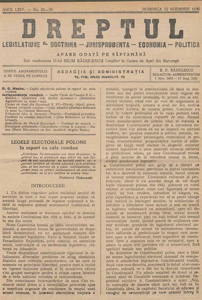 Dreptul, LXIV, nr. în TOM: 29-30, 22 noiembrie, 1936 Descarcă Citește × --> Anul publicației: 1936 Publicată de: Institutul de Istorie „Nicolae Iorga” București Contributori: Institutul de Istorie „Nicolae Iorga” București Tipul publicației: periodic Vezi publicația: Dreptul Domenii asociate: Drept, Științe juridice