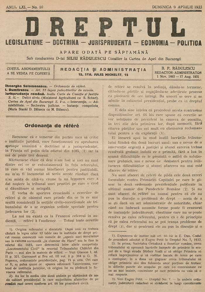 Dreptul, LXI, nr. în TOM: 10, 9 aprilie, 1933 Descarcă Citește × --> Anul publicației: 1933 Publicată de: Institutul de Istorie „Nicolae Iorga” București Contributori: Institutul de Istorie „Nicolae Iorga” București Tipul publicației: periodic Vezi publicația: Dreptul Domenii asociate: Drept, Științe juridice