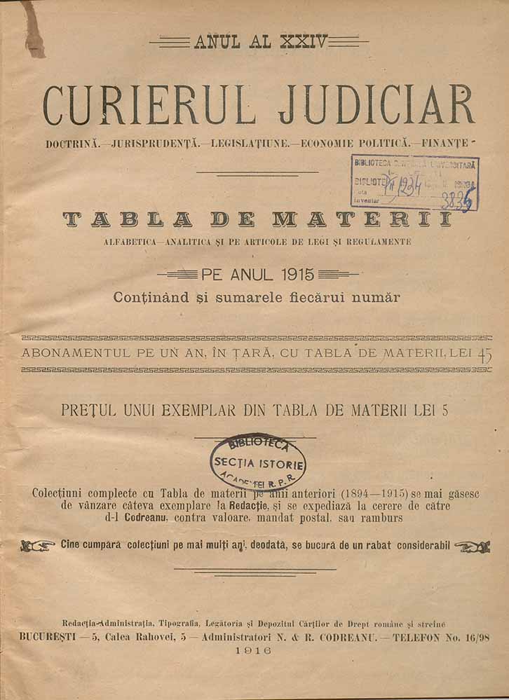 Curierul Judiciar, 1915, Tabla de materii alfabetică - analitică și pe articole de legi și regulamente pe anul 1915