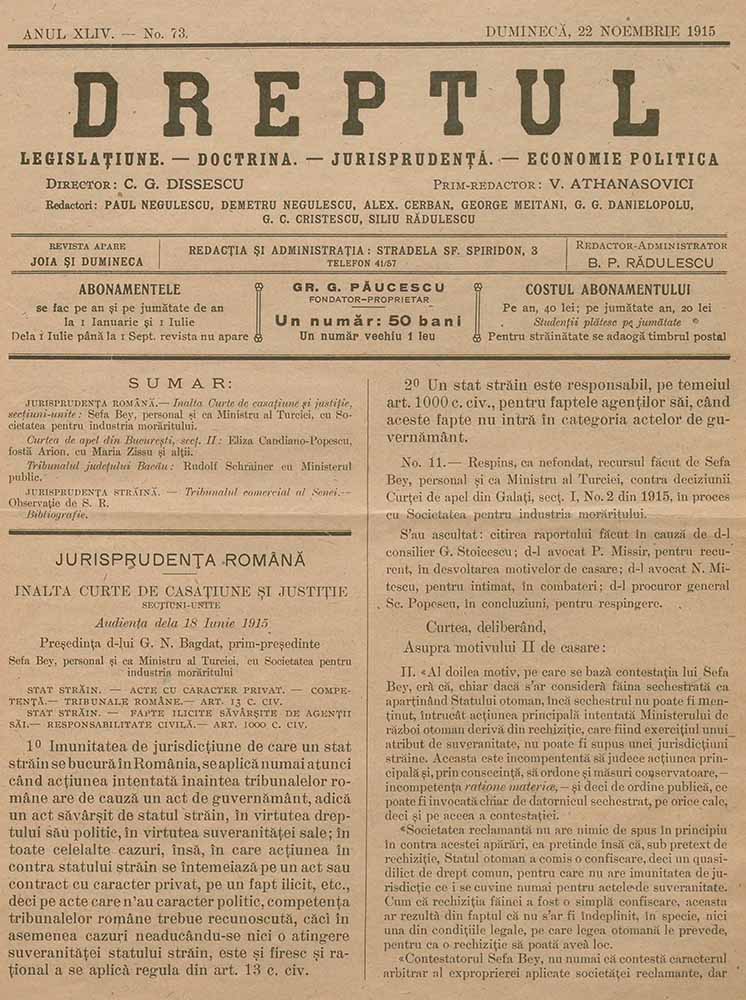 Dreptul, XLIV, nr. în TOM: 73, 22 noiembrie, 1915 Descarcă Citește × --> Anul publicației: 1915 Publicată de: Institutul de Istorie „Nicolae Iorga” București Contributori: Institutul de Istorie „Nicolae Iorga” București Tipul publicației: periodic Vezi publicația: Dreptul Domenii asociate: Drept, Științe juridice