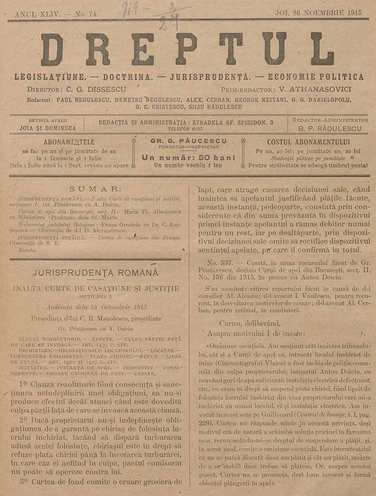 Dreptul, XLIV, nr. în TOM: 74, 26 noiembrie, 1915 Descarcă Citește × --> Anul publicației: 1915 Publicată de: Institutul de Istorie „Nicolae Iorga” București Contributori: Institutul de Istorie „Nicolae Iorga” București Tipul publicației: periodic Vezi publicația: Dreptul Domenii asociate: Drept, Științe juridice