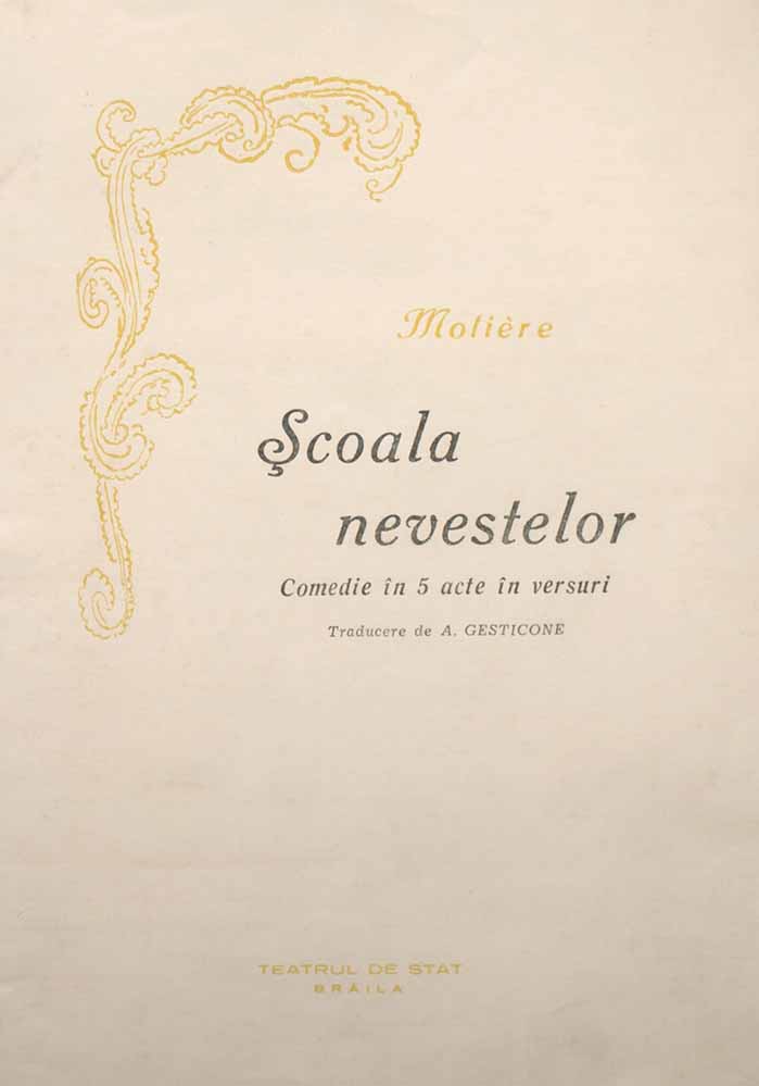 - Descriptori asociați: caiet de spectacol, caiet program, Dumitru Dinulescu, istoria teatrului, Jean Baptiste Poquelin, Mihail Gavrilov, Molière, piesă de teatru, program teatral, Teatrul „Maria Filotti” din Brăila, TMF