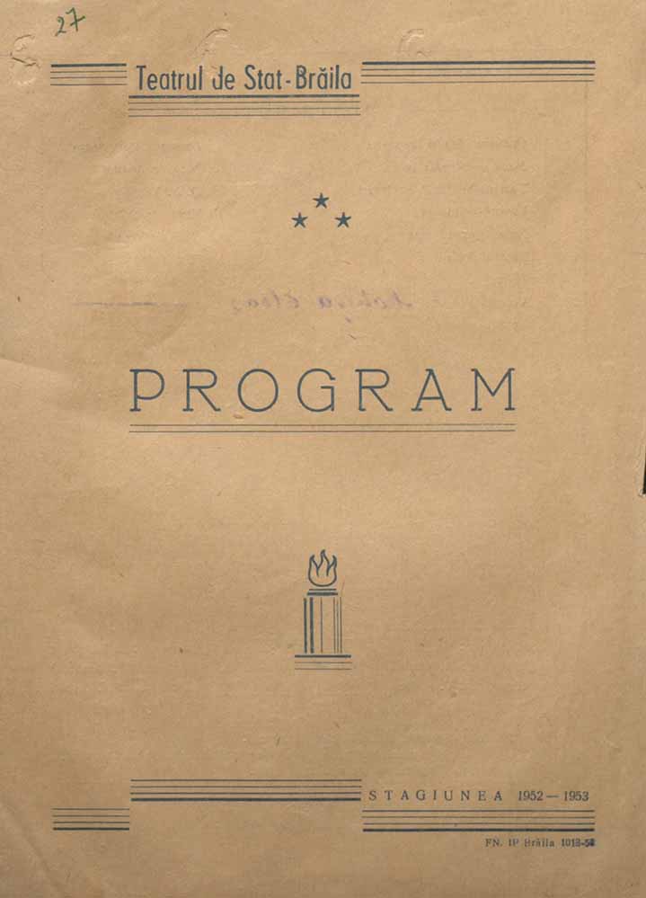 - Descriptori asociați: Aleksandr Nikolaevici Afinoghenov, caiet de spectacol, caiet program, istoria teatrului, Lascăr Sebastian, Mihail Gavrilov, piesă de teatru, program teatral, Teatrul „Maria Filotti” din Brăila, TMF, Tudor Mușatescu