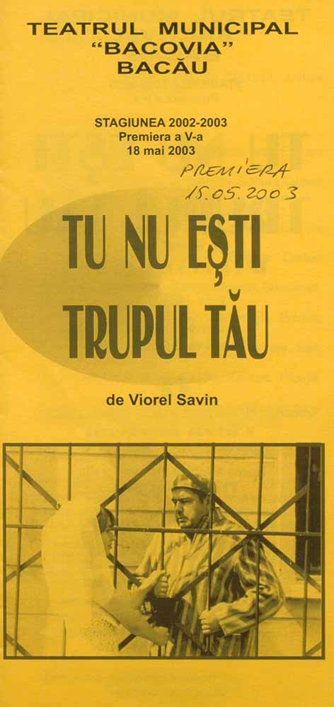- Descriptori asociați: caiet de spectacol, caiet program, Florin Zăncescu, Luiza Sarivan, piesă de teatru, Teatrul Municipal George Bacovia Bacău, Viorel Savin