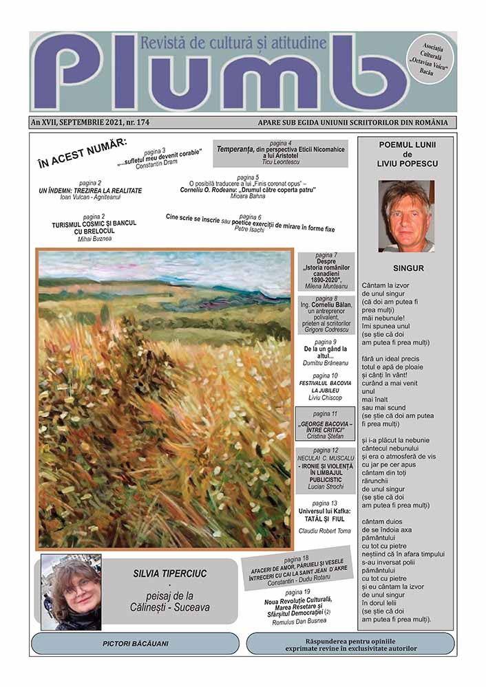 - Descriptori asociați: Aristotel, Asociația Cultural Octavian Voicu Bacău, Corneliu Rodeanu, critică literară, cronică literară, cultură română, cultură română contemporană, eseistică, Etica nicomahică, Festivalul Bacovia, Franz Kafka, George Bacovia, Ioan Vulcan-Agniteanul, Istoria românilor canadieni: 1890 - 2020, jurnal, lectură, limbaj publicistc, Literatură română, literatură română contemporană, nuvelă, pictor băcăuani, poeți băcăauni, poeți români, poezie, poveste, proză, Roman, scriitori băcăuani, scriitori români, teme literare contemporane, Uniunea Scriitorilor din România