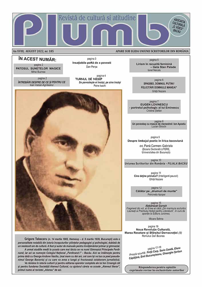 - Descriptori asociați: Abdulrazak Gurnah, Asociația Culturală Octavian Voicu Bacău, critică literară, cultură română, cultură română contemporană, Elena Căpățână, Emil Bucureșteanu, eseistică, Eugen Lovinescu, Firiță Carp, George Bacovia, Geta Stan Palade, Gheorghe Șerban, Grigore Tabacaru, Ion Apostu, jurnal, lectură, lirism, Literatură română, literatură română contemporană, memorialistică, Mihai Eminescu, nuvelă, poeți băcăuani, poeți români, poezie, poezie bacoviană, poveste, proză, scriitori băcăuani, scriitori români, Sorin Coadă, teme literare contemporane, Uniunea Scriitorilor din România