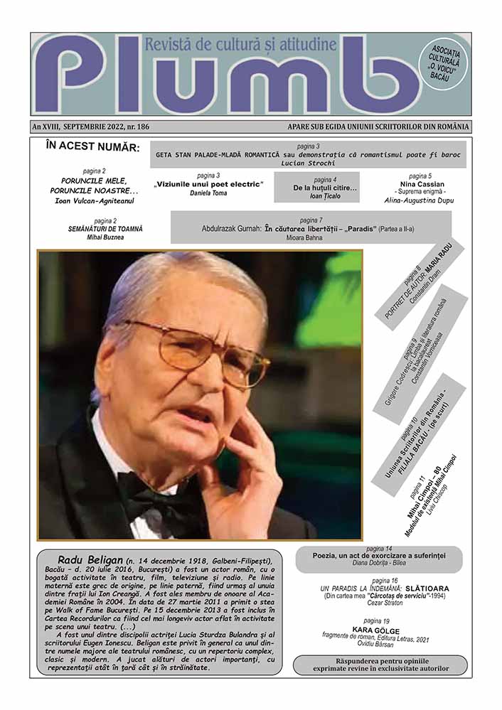 - Descriptori asociați: Abdulrazak Gurnah, Asociația Culturală Octavian Voicu Bacău, critică literară, cultură română, cultură română contemporană, eseistică, Geta Stan Palade, Grigore Codrescu, huțuli, jurnal, Kara Golge, lectură, limba și literatura română, Literatură română, literatură română contemporană, Maria Radu, memorialistică, Mihai Cimpoi, Nina Cassian, nuvelă, poeți băcăuani, poeți români, poezie, poveste, proză, Radu Beligan, Roman, scriitori băcăuani, scriitori români, Slătioara, teme literare contemporane, Uniunea Scriitorilor din România