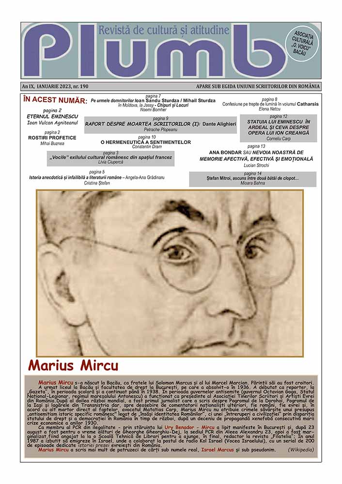 - Descriptori asociați: Ana Bondar, Asociația Culturală Octavian Voicu Bacău, catharsis, critică literară, cronică literară, cultură română, cultură română contemporană, Dante Alighieri, eseistică, exilul cultural românesc, Ioan Sandu Sturdza, Ion Creangă, jurnal, lectură, limba și literatura română, Literatură română, literatură română contemporană, Marius Mircu, memorialistică, Mihai Eminescu, Mihail Sturdza, nuvelă, poeți băcăuani, poeți români, poezie, poveste, proză, Roman, scriitori băcăuani, scriitori români, Ștefan Mitroi, teme literare contemporane, Uniunea Scriitorilor din România