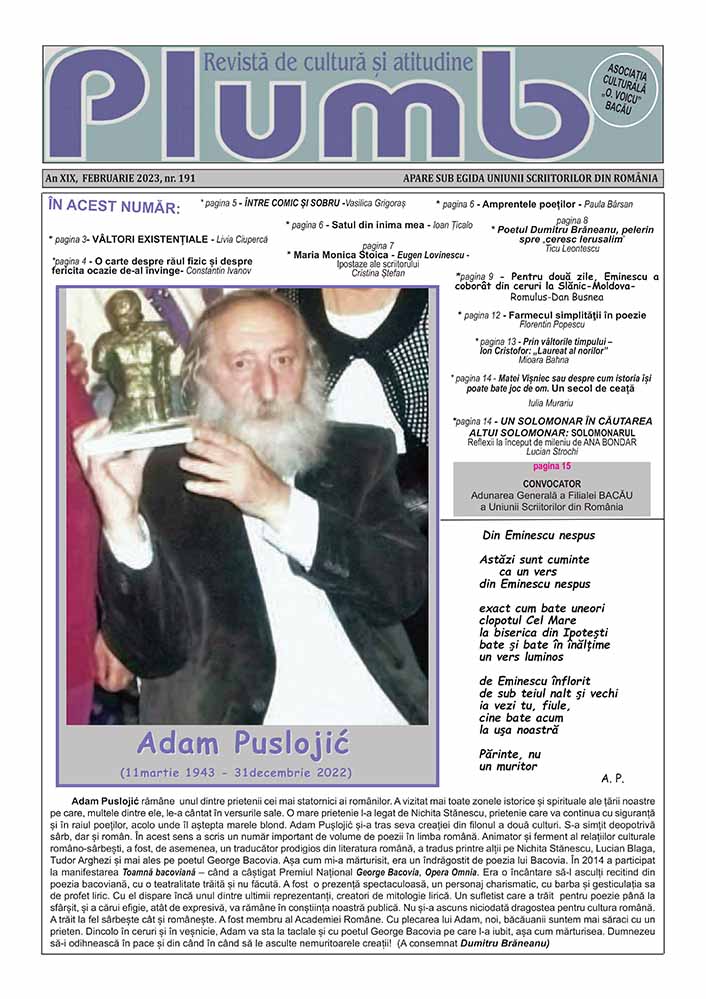 - Descriptori asociați: Adam Puslojic, Asociația Culturală Octavian Voicu Bacău, critică literară, cronică literară, cultură română, cultură română contemporană, Dumitru Brăneanu, eseistică, Eugen Lovinescu, Ion Cristofor, jurnal, lectură, Literatură română, literatură română contemporană, Maria Monica Stoica, Matei Vișniec, memorialistică, Mihai Eminescu, nuvelă, poeți băcăuani, poeți români, poezie, poveste, proză, scriitori băcăuani, scriitori români, solomonar, teme literare contemporane, Uniunea Scriitorilor din România