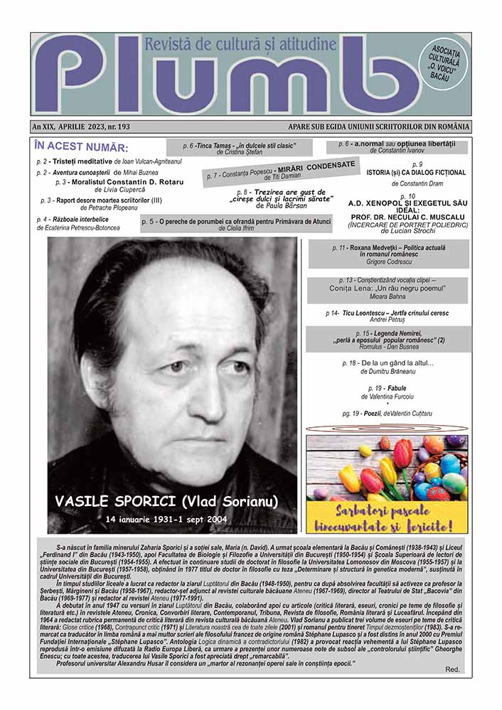 - Descriptori asociați: Alexandru Xenopol, Asociația Culturală Octavian Voicu Bacău, Constantin D. Rotaru, critică literară, cronică literară, cultură română, cultură română contemporană, eseistică, jurnal, lectură, Legenda Nemirei, Literatură română, literatură română contemporană, memorialistică, Neculai C. Muscalu, nuvelă, poeți băcăuani, poeți români, poezie, poveste, proză, Roman, Roxana Medvețki, scriitori băcăuani, scriitori români, teme literare contemporane, Ticu Leontescu, Tinca Tamaș, Uniunea Scriitorilor din România, Vasile Sporici, Vlad Sorianu