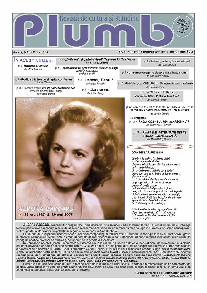 - Descriptori asociați: Asociația Culturală Octavian Voicu Bacău, Aurora Barcaru, critică literară, cronică literară, cultură română, cultură română contemporană, egocentrism, eseistică, Ion Vianu, Ionel Rusu, jurnal, lectură, Literatură română, literatură română contemporană, memorialistică, Mihai Eminescu, nuvelă, poeți băcăuani, poeți români, poezie, poveste, proză, proza eminesciană, psihologie, Radu Cosașu, Rodica Lăzărescu, Roman, scriitori băcăuani, scriitori români, teme literare contemporane, teocentrism, Tincuța Horonceanu Bernevic, Uniunea Scriitorilor din România, Veronica Călin