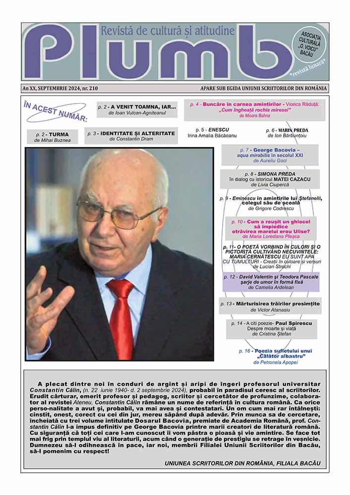 - Descriptori asociați: Asociația Cultural Octavian Voicu Bacău, Constantin Călin, critică literară, cronică literară, cultură română, cultură română contemporană, Dan Valentin, dialog, eseistică, George Bacovia, George Enescu, jurnal, lectură, Literatură română, literatură română contemporană, Maria Cernătescu, Marin Preda, Matei Cazacu, memorialistică, Mihai Eminescu, nuvelă, Paul Spirescu, poeți băcăuani, poeți români, poezie, poveste, proză, Roman, scriitori băcăuani, scriitori români, Simona Preda, teme literare contemporane, Teodora Pascale, Toamna, umor, Uniunea Scriitorilor din România