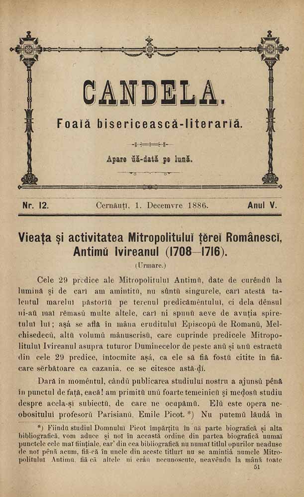 Candela, V, nr. în TOM: 12, decembrie, 1886, Foaiă bisericească-literariă