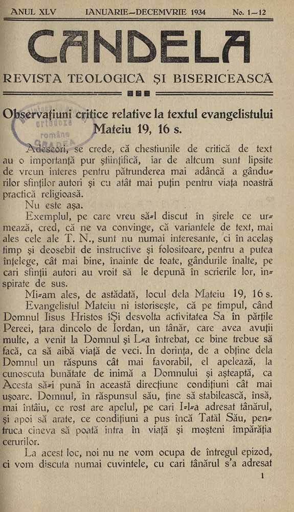 Candela, XLV, nr. în TOM: 1-12, ianuarie-decembrie, 1934, Revistă teologică și bisericească