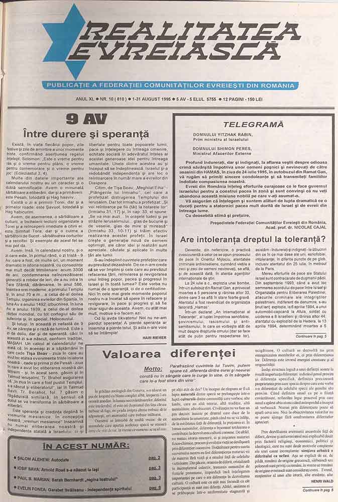 Revista Cultului Mozaic, XL, nr. în TOM: 10, 1-31 august, 1995, Realitatea evreiască