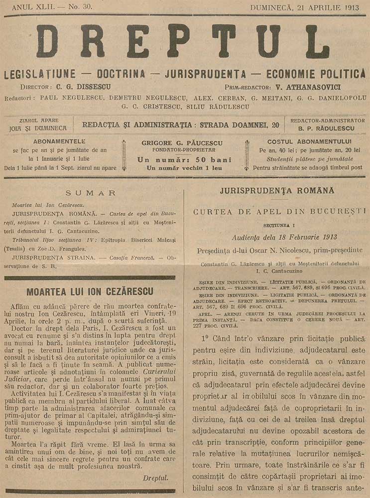 Dreptul, XLII, nr. în TOM: 30, 21 aprilie, 1913 Descarcă Citește × --> Anul publicației: 1913 Publicată de: Institutul de Istorie „Nicolae Iorga” București Contributori: Institutul de Istorie „Nicolae Iorga” București Tipul publicației: periodic Vezi publicația: Dreptul Domenii asociate: Drept, Științe juridice