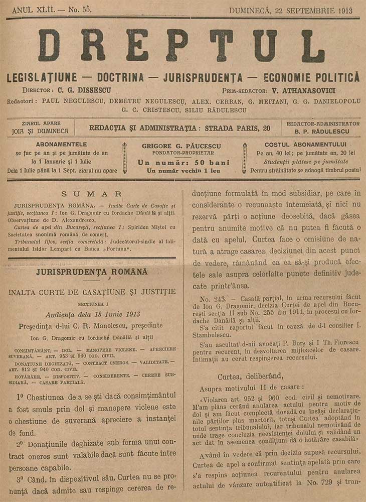 Dreptul, XLII, nr. în TOM: 55, 22 septembrie, 1913 Descarcă Citește × --> Anul publicației: 1913 Publicată de: Institutul de Istorie „Nicolae Iorga” București Contributori: Institutul de Istorie „Nicolae Iorga” București Tipul publicației: periodic Vezi publicația: Dreptul Domenii asociate: Drept, Științe juridice