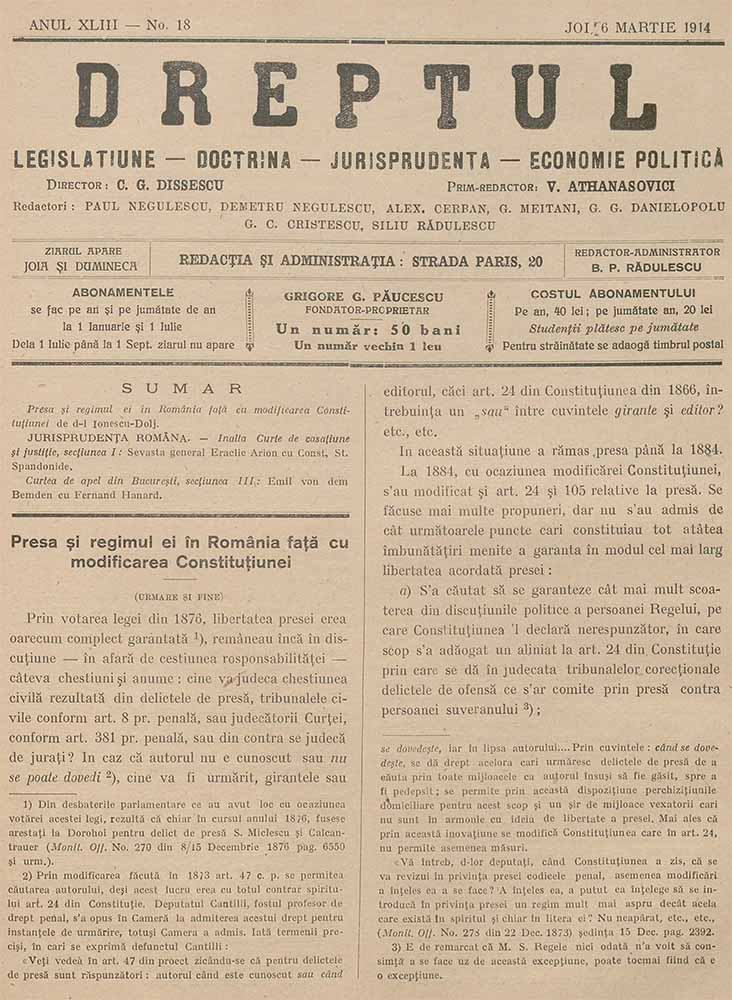 Dreptul, XLIII, nr. în TOM: 18, 6 martie, 1914 Descarcă Citește × --> Anul publicației: 1914 Publicată de: Institutul de Istorie „Nicolae Iorga” București Contributori: Institutul de Istorie „Nicolae Iorga” București Tipul publicației: periodic Vezi publicația: Dreptul Domenii asociate: Drept, Științe juridice