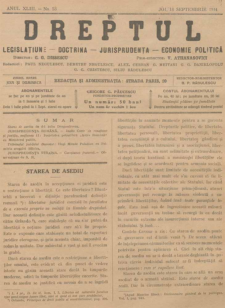 Dreptul, XLIII, nr. în TOM: 53, 18 septembrie, 1914 Descarcă Citește × --> Anul publicației: 1914 Publicată de: Institutul de Istorie „Nicolae Iorga” București Contributori: Institutul de Istorie „Nicolae Iorga” București Tipul publicației: periodic Vezi publicația: Dreptul Domenii asociate: Drept, Științe juridice