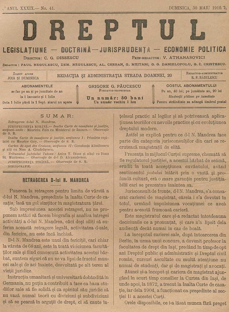 Dreptul, XXXIX, nr. în TOM: 41, 30 mai, 1910 Descarcă Citește × --> Anul publicației: 1910 Publicată de: Institutul de Istorie „Nicolae Iorga” București Contributori: Institutul de Istorie „Nicolae Iorga” București Tipul publicației: periodic Vezi publicația: Dreptul Domenii asociate: Drept, Științe juridice
