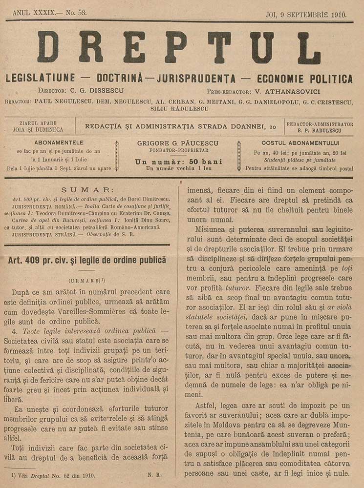Dreptul, XXXIX, nr. în TOM: 53, 9 septembrie, 1910 Descarcă Citește × --> Anul publicației: 1910 Publicată de: Institutul de Istorie „Nicolae Iorga” București Contributori: Institutul de Istorie „Nicolae Iorga” București Tipul publicației: periodic Vezi publicația: Dreptul Domenii asociate: Drept, Științe juridice