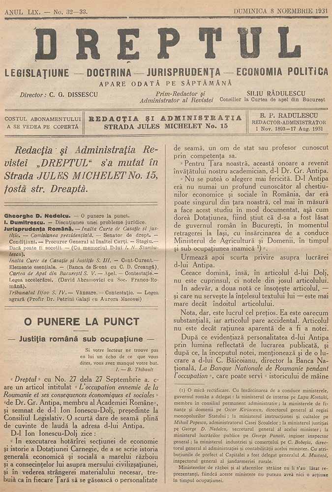 Dreptul, LIX, nr. în TOM: 32-33, 8 noiembrie, 1931 Descarcă Citește × --> Anul publicației: 1931 Publicată de: Institutul de Istorie „Nicolae Iorga” București Contributori: Institutul de Istorie „Nicolae Iorga” București Tipul publicației: periodic Vezi publicația: Dreptul Domenii asociate: Drept, Științe juridice