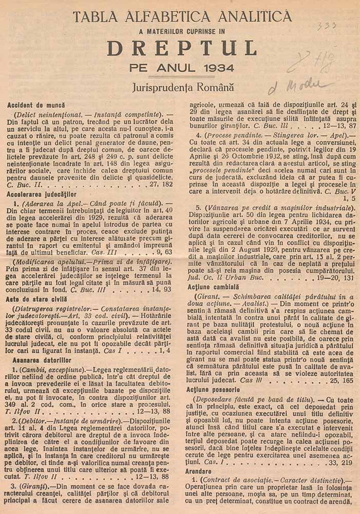 Dreptul, LXII, 1934, Tabela alfabetică analitică a materiilor cuprinse în „Dreptul" pe anul 1934