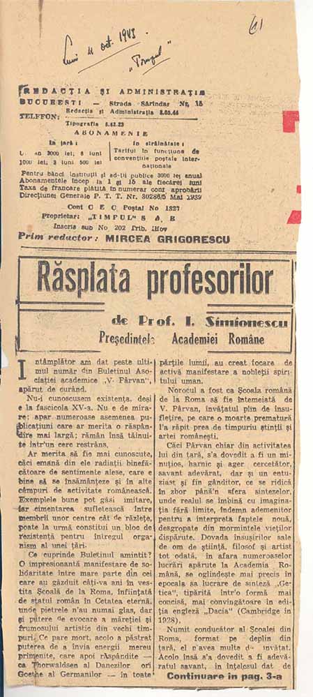 Omagiu adus lui Vasile Pârvan - articole, 1923, Răsplata profesorilor Descarcă Citește × --> Realizatori:  SIMIONESCU, I. (autor) Anul publicației: 1923 Subtitlu: Răsplata profesorilor Tipul publicației: literatură gri Vezi publicația: Omagiu adus lui Vasile Pârvan - articole