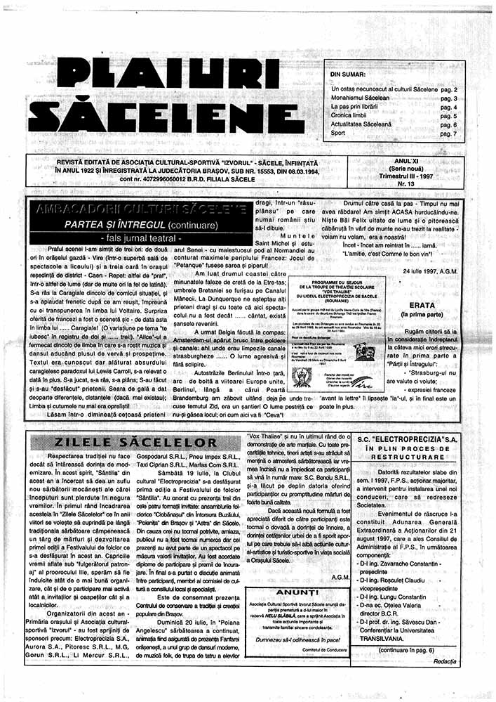 Plaiuri Săcelene, XI, nr. în TOM: 13, 1997, Serie Nouă