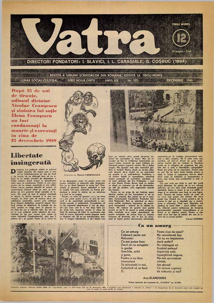 Vatra, 225, nr. în TOM: 12, decembrie, 1989, După 25 de ani de tiranie, odiosul dictator Nicolae Ceaușescu și sinistra lui soție Elena Ceaușescu au fost condamnați la moarte și executați în ziua de 25 decembrie 1989
